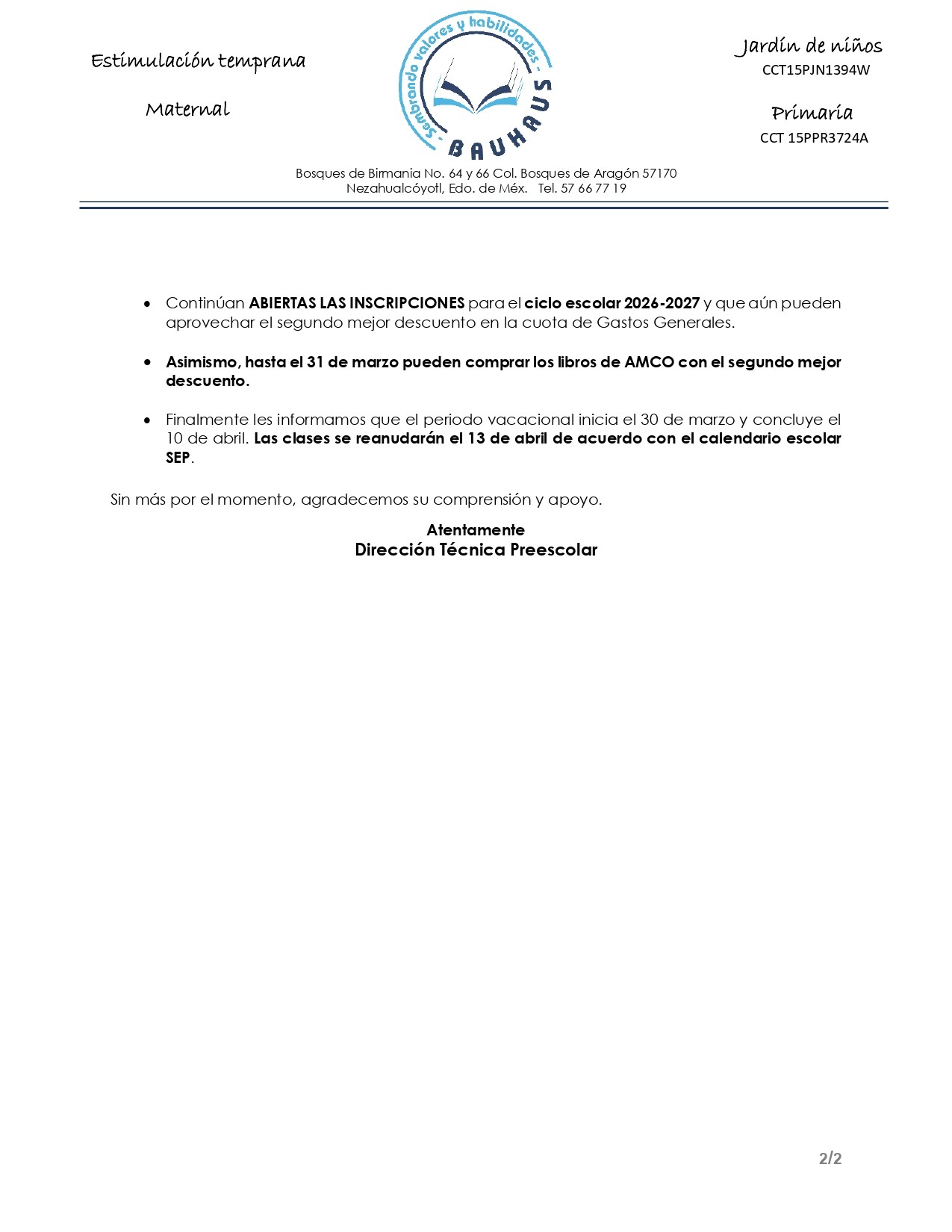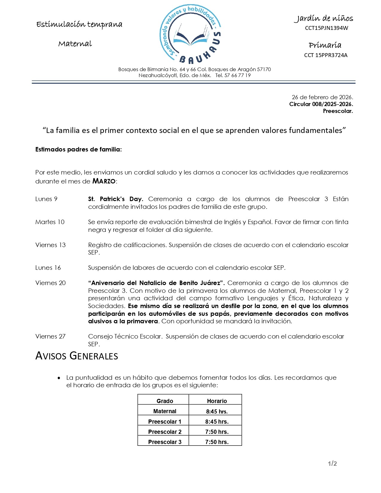 Circular marzo 2026 Preescolar
